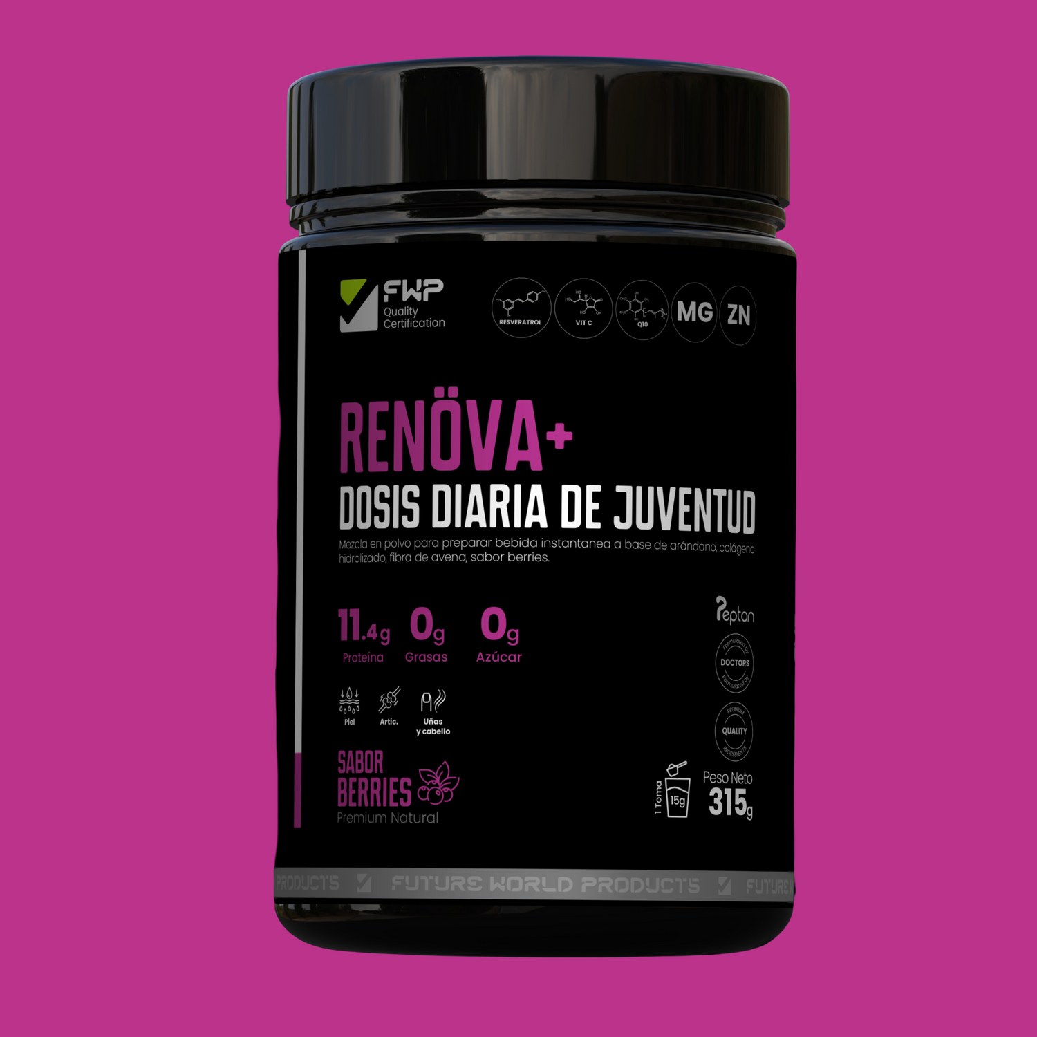 Colágeno hidrolizado premium con Biopéptidos Activos, Resveratrol, Coenzima Q10, Zinc y Magnesio que revitalizan tu piel, uñas, cabello y articulaciones, mientras combaten el envejecimiento celular ✨💪.
